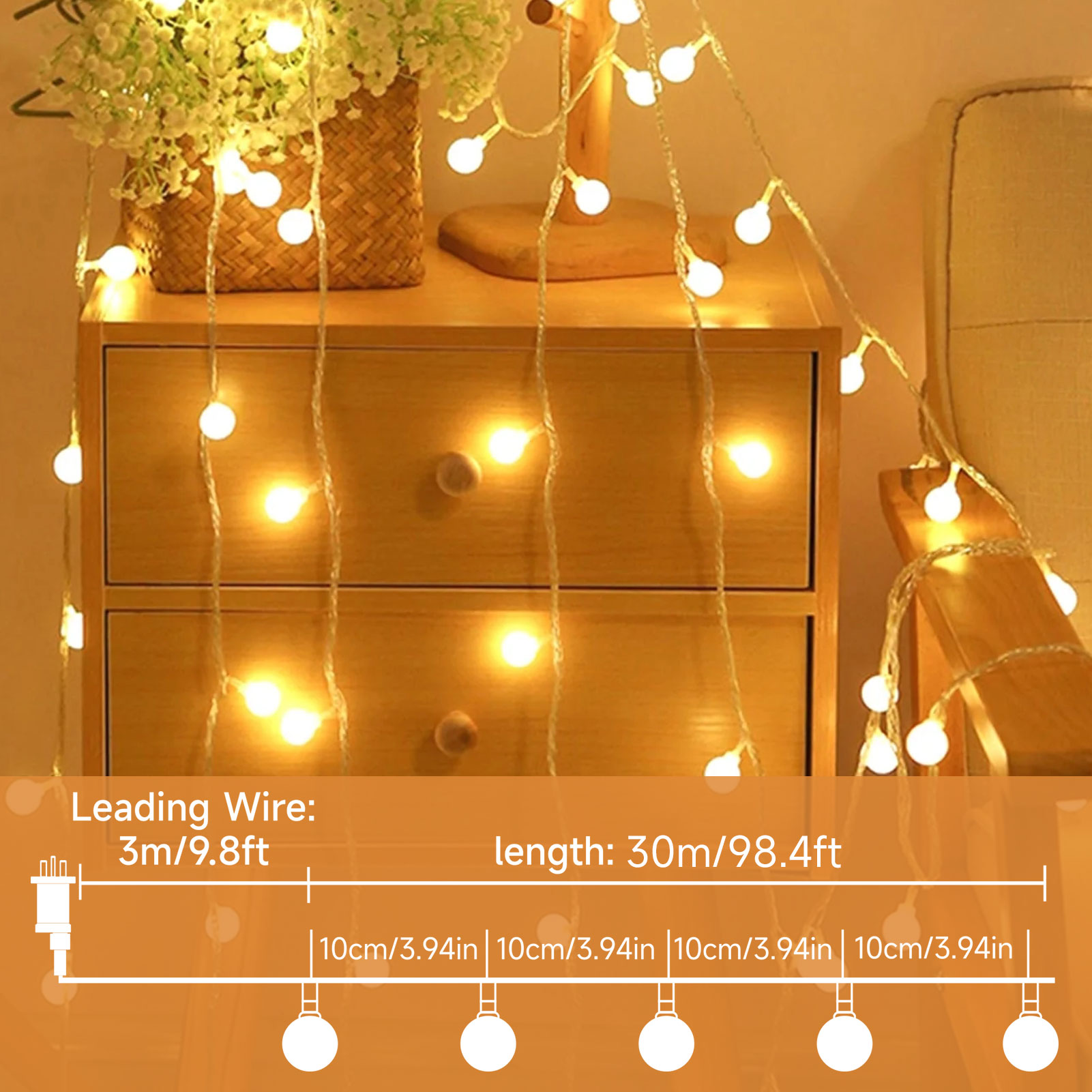 WOWDSGN 30M 300Led Globe String Lights with plug, 8 mode, timer, memory function, IP44 waterproof