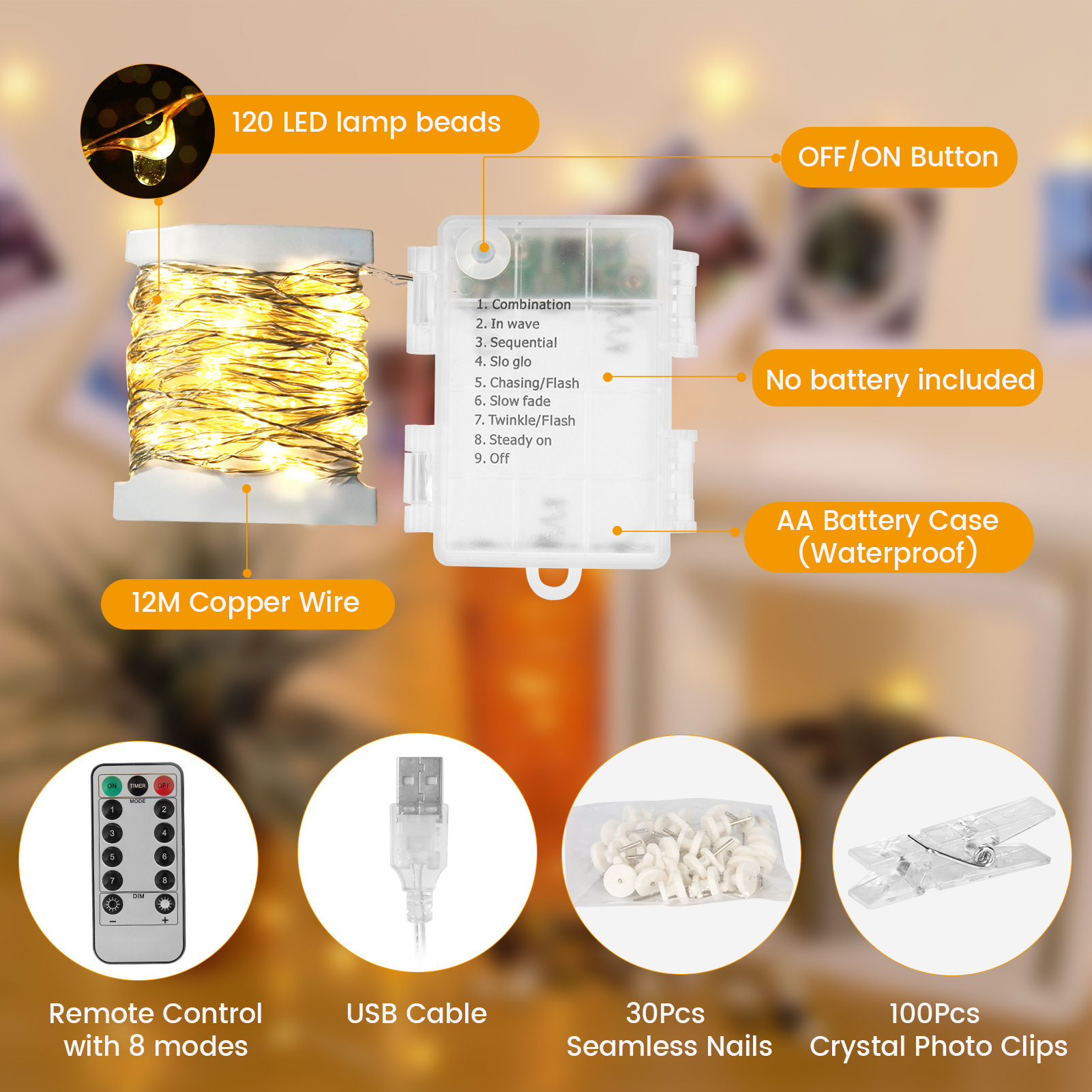 12 m 120 LEDs Photo Lights with 100 Clips and 30 Nails, 8 Mode USB/Battery Operated Pictures, Polaroid Fairy Lights for Room, Wall, Window, Christmas, Wedding