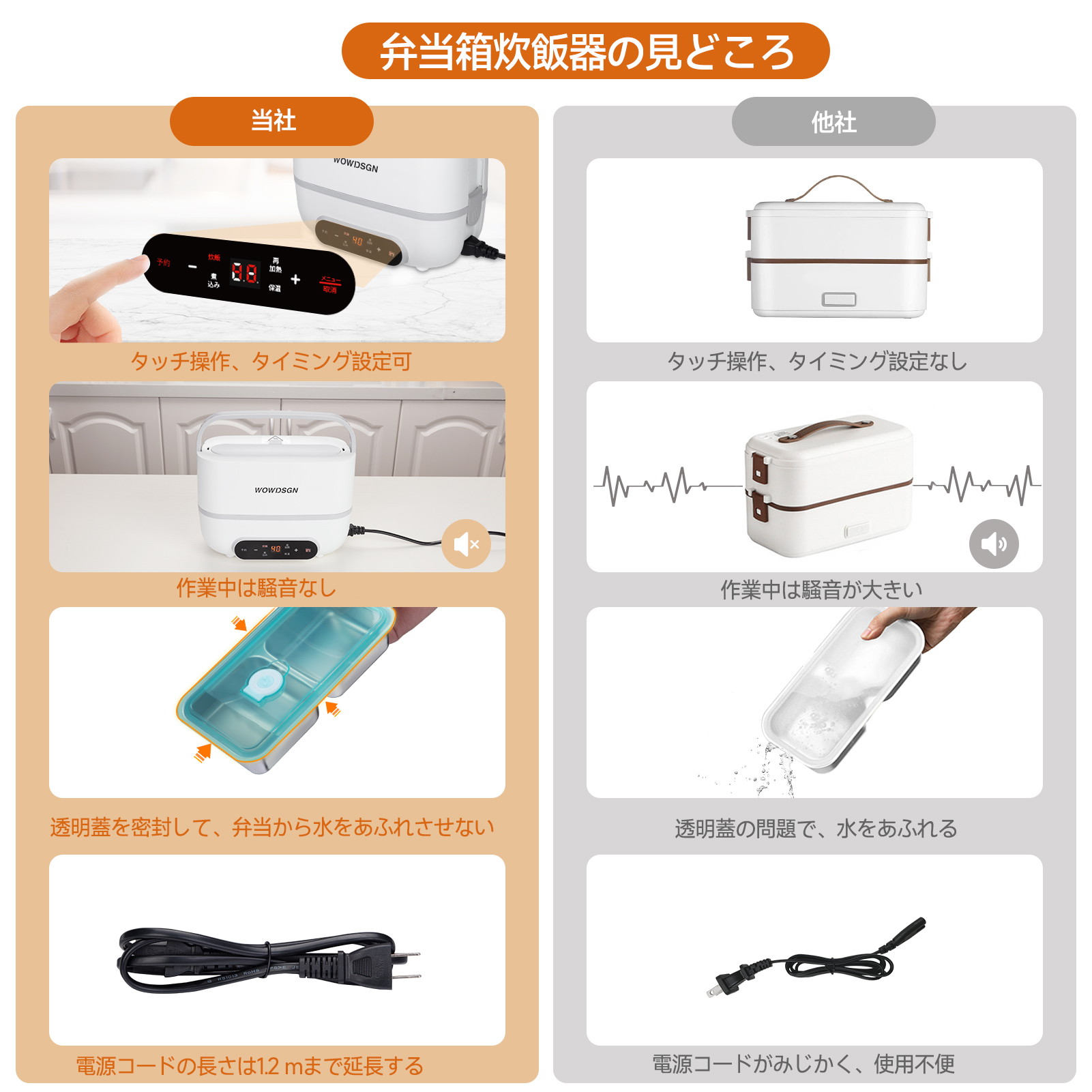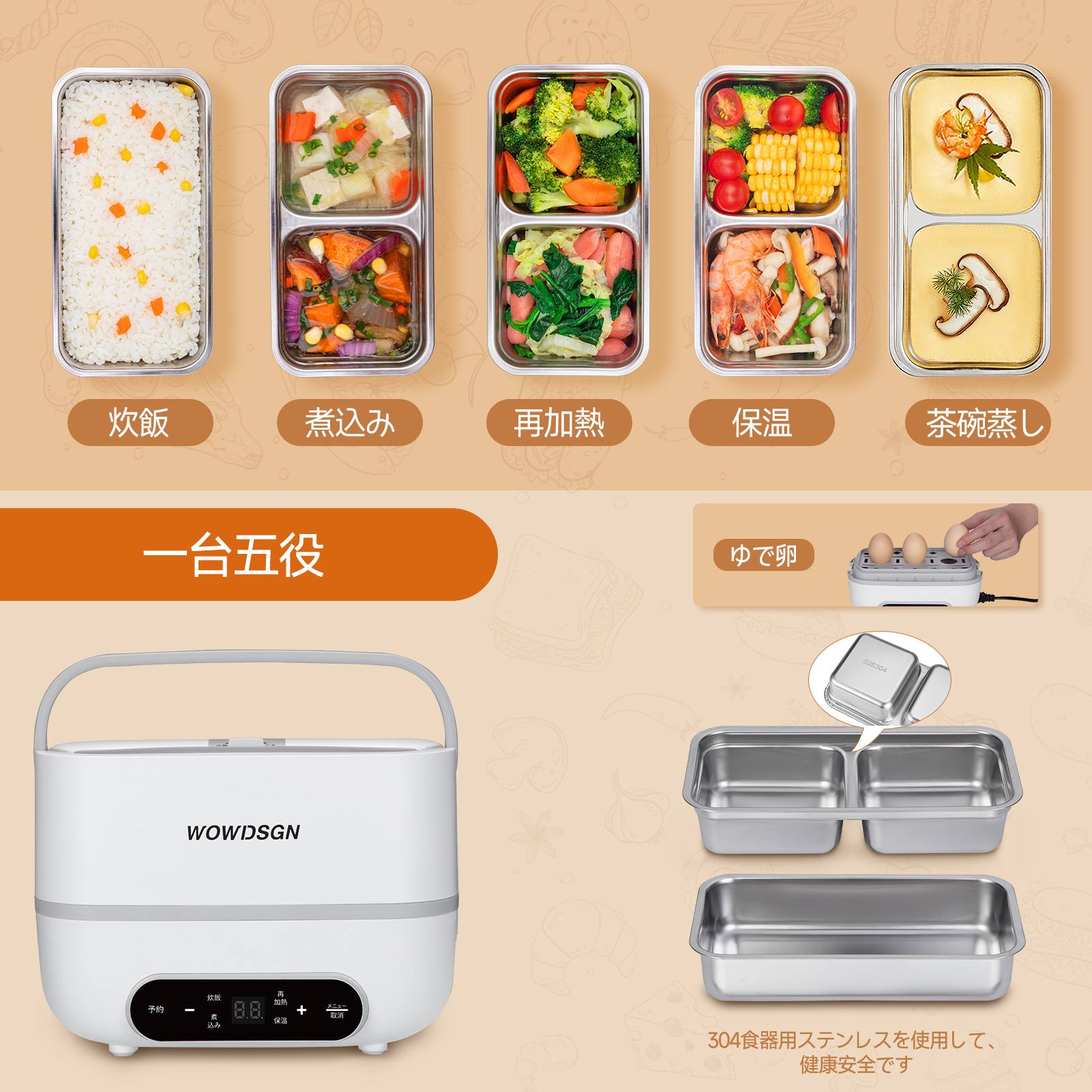 ·WOWDSGN small rice cooker for one person ·Five overwhelming reasons to be chosen ①Timing settings and touch buttons ②Convenient to carry ③Simple design and easy to use ④Cook quietly worrying about the surroundings ⑤5-in-1(cook rice/stew/heating/keep warm/boiled eggs) |